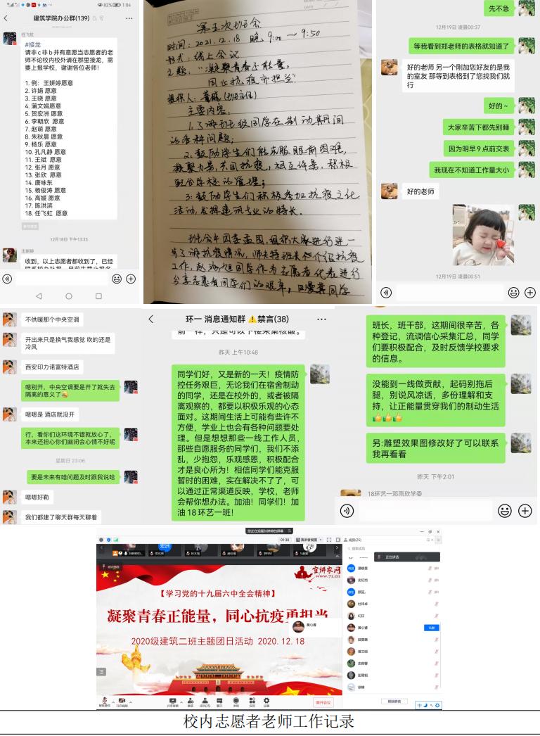 志愿服务,党员先行。风景园林支部党员及时响应学院党委的号召,带领全系所有老师,第一时间申请加入志愿者队伍,做到了全员连动,不落一人。系主任白骅、支部组织委员李朝欣分别加入小寨校区、东家属院疫情防控联络队伍;王斌、任飞虹、董晓、贺宏洲担任临时班主任,随时为学生提供咨询与答疑,做好政策通知的上传下达,为学生做好各方服务;马西娜、张文婷、朱秋晨积极申请研究生监考;支部书记吴焱、宣传委员杨乐、教师刘丹加入学院宣传工作组。