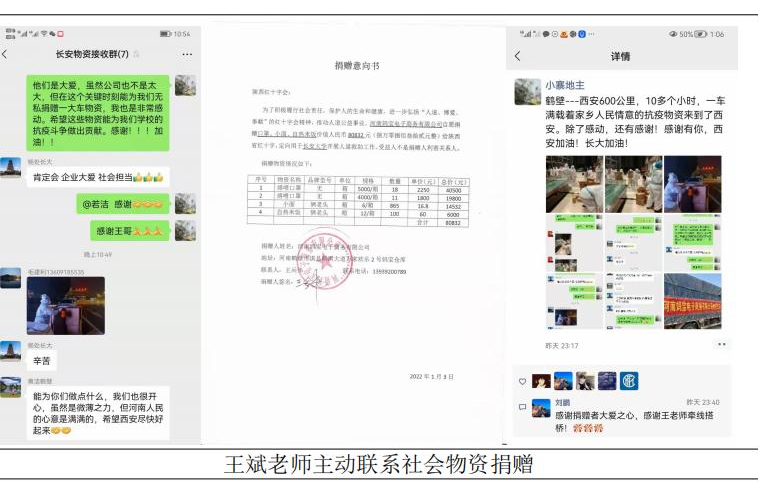 抗击疫情,万众一心。教师王斌在居家隔离期间,主动承担来自家乡河南省鹤壁市河南宝妈电子商务有限公司救援物资捐赠的联络对接工作。河南宝妈电子商务有限公司的救援物资经过10多个小时的运送已于2022年1月3日晚送达西安,定点捐赠给长安大学,合计80832元抗疫物资。