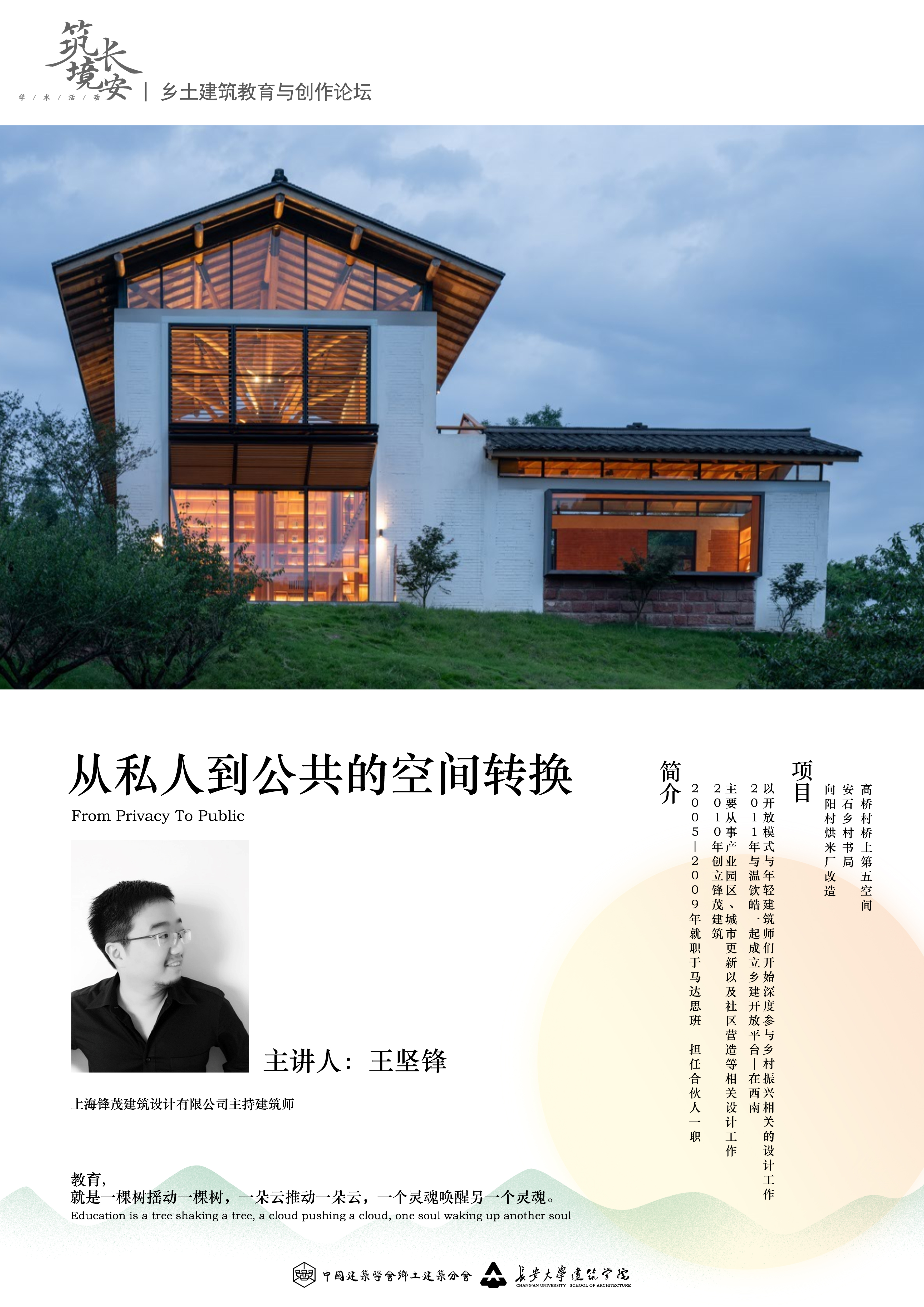 乡村是中华文明基因的载体,是集生活与生产、社会与文化、历史与政治于一身的文明体。乡村振兴战略是治国方略的重要组成部分。近年来,乡村振兴日益受到党和政府的日益重视,在党的十九大报告及中央2022年第一号文件中都指出了实施乡村振兴战略的重要性。乡土建筑,则包含了对历史建筑、地域建筑、传统建筑、传统民居、历史保护单位等的详实解读,其孕育在乡村振兴的广袤土壤之中。我国建筑院校的学者和一线建筑师们都尝试以多重身份介入到乡村振兴背景下的建筑创作之中,并取得了卓有成效的成果。本次论坛邀请多位知名学者及建筑师,从教育和实践的角度进行研究剖析和项目分享,提出当下乡土建筑具体项目实施的策略与方法。