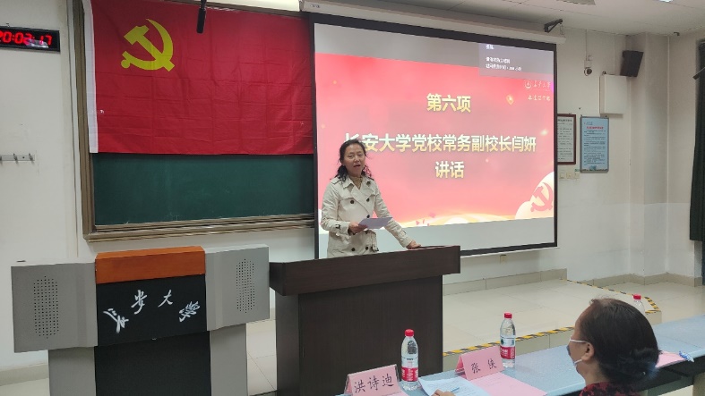 长安大学党校常务副校长闫妍带领同学们回顾了中国共产党成立至今的百年光辉历程,希望同学们继续深入党史学习,不断从百年党史中汲取力量,用奋斗之光点亮青春梦想。她强调,只要坚持中国共产党的领导,就能战胜一切困难,要求同学们做到:坚定理想信念,进一步坚定“听党话跟党走”的信心和决定;提高政治素养,不忘入党初心继续奋斗前行;强化理论学习,提升实践能力增强为人民服务的本领。