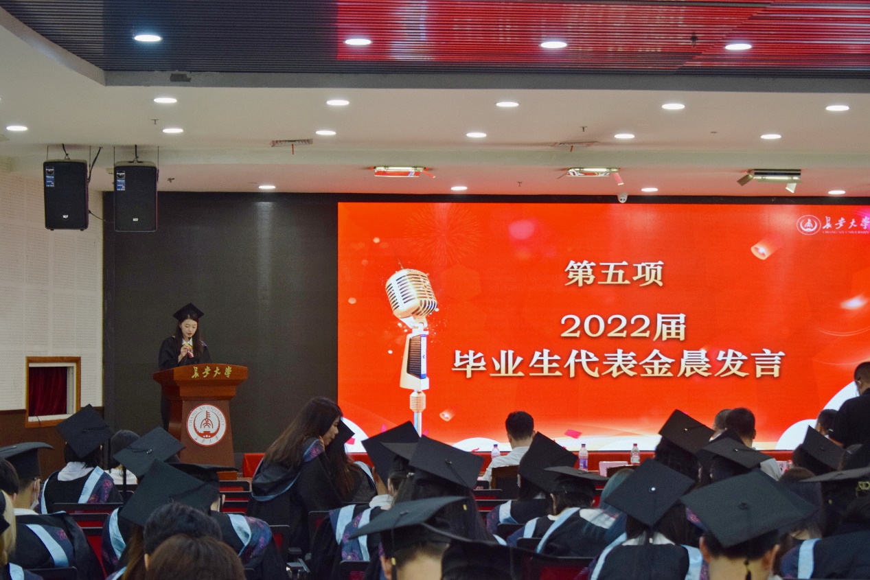 2022届金晨同学作为毕业生代表,回首过往,展望未来;她鼓励毕业生们在百年征程中牢记自己的初心,承担自己的使命,用内心把握时代脉搏,作伟大理想的接班人,伟大事业的生力军。