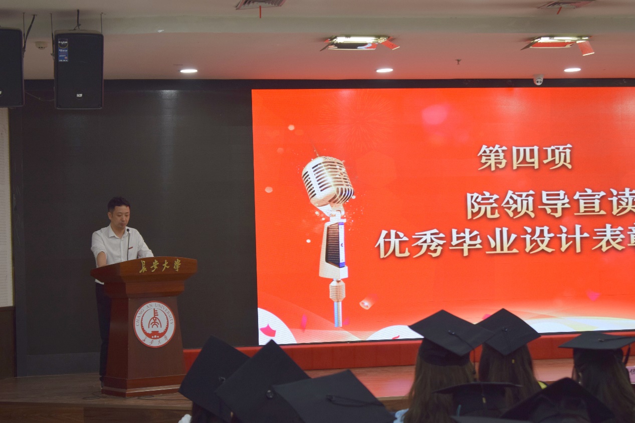 刘启波副院长宣读了陕西省教育厅办公室《关于表彰2022届陕西高校优秀毕业生和优秀学生干部的通报》和长安大学《关于表彰2022届本科优秀毕业生的决定》;我院金晨、白文琦同学分别获评“2022届陕西高校优秀毕业生干部”“2022届陕西高校优秀毕业生”,金晨和白文琦同学获评长安大学一等奖学金,汤赵琳等18名同学获二等奖学金。余侃华副院长宣读了长安大学《关于表彰2022届优秀本科毕业设计(论文)及指导教师的决定》,我院金晨等14名同学获评“优秀本科毕业设计”,侯全华等14名教师获评“优秀毕业设计指导老师”。