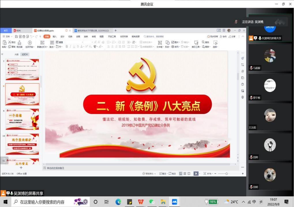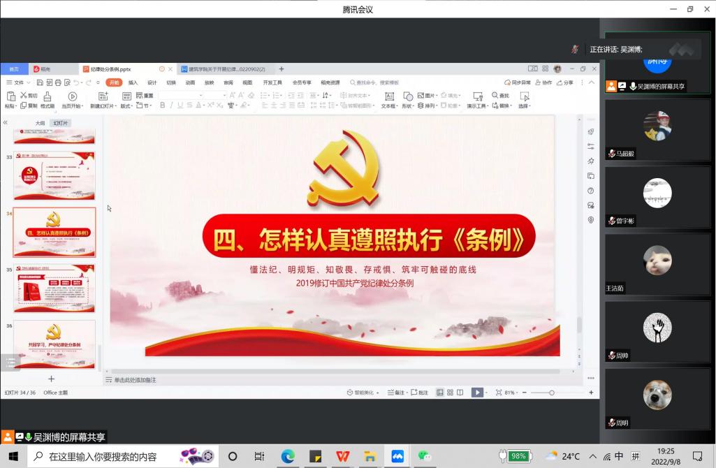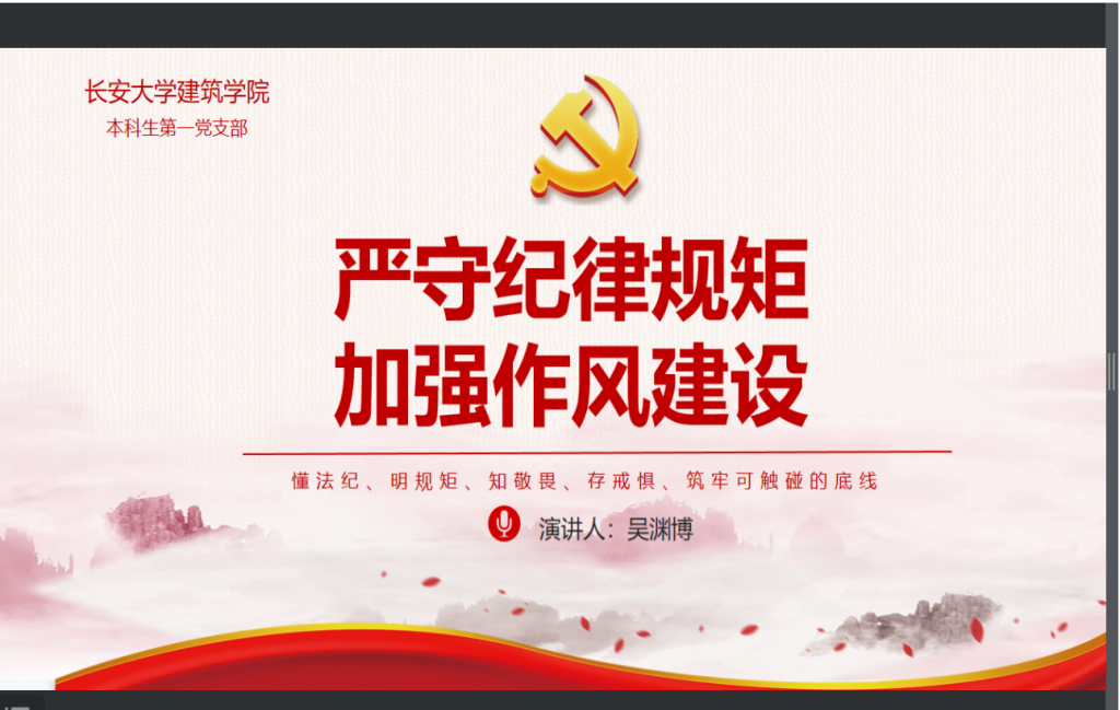 为落实全面从严治党要求和立德树人根本任务,根据学校开展纪律教育学习宣传月和师德师风宣传教育月活动的部署要求,澳门新葡京平台 本科生第一党支部于9月8日展开“严守纪律规矩 加强作风建设”学习活动,澳门新葡京平台 本科生第一党支部全体成员参加此次活动。通过纪律学习,提高支部成员的法纪意识,加强纪律作风建设,筑牢拒腐防变思想,廉政文化进一步升华,一体推进不敢腐、不能腐、不想腐成效显现。活动由吴渊博同志主持。
