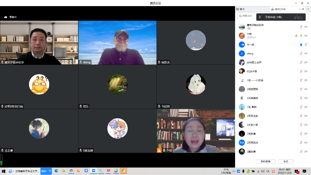 11月24日晚,澳门新葡京平台 为了激发我院学生对建筑专业学习的热情和兴趣,特地邀请了Douglas King先生进行了主题为城市高层垂直建筑的专题讲座——HIGH RISE URBAN HEALTHCARE。本次会议在腾讯会议线上举办,由余侃华副院长主持,我院王少锐老师、任娟老师、周艳龙老师及250多名学生共同参加。