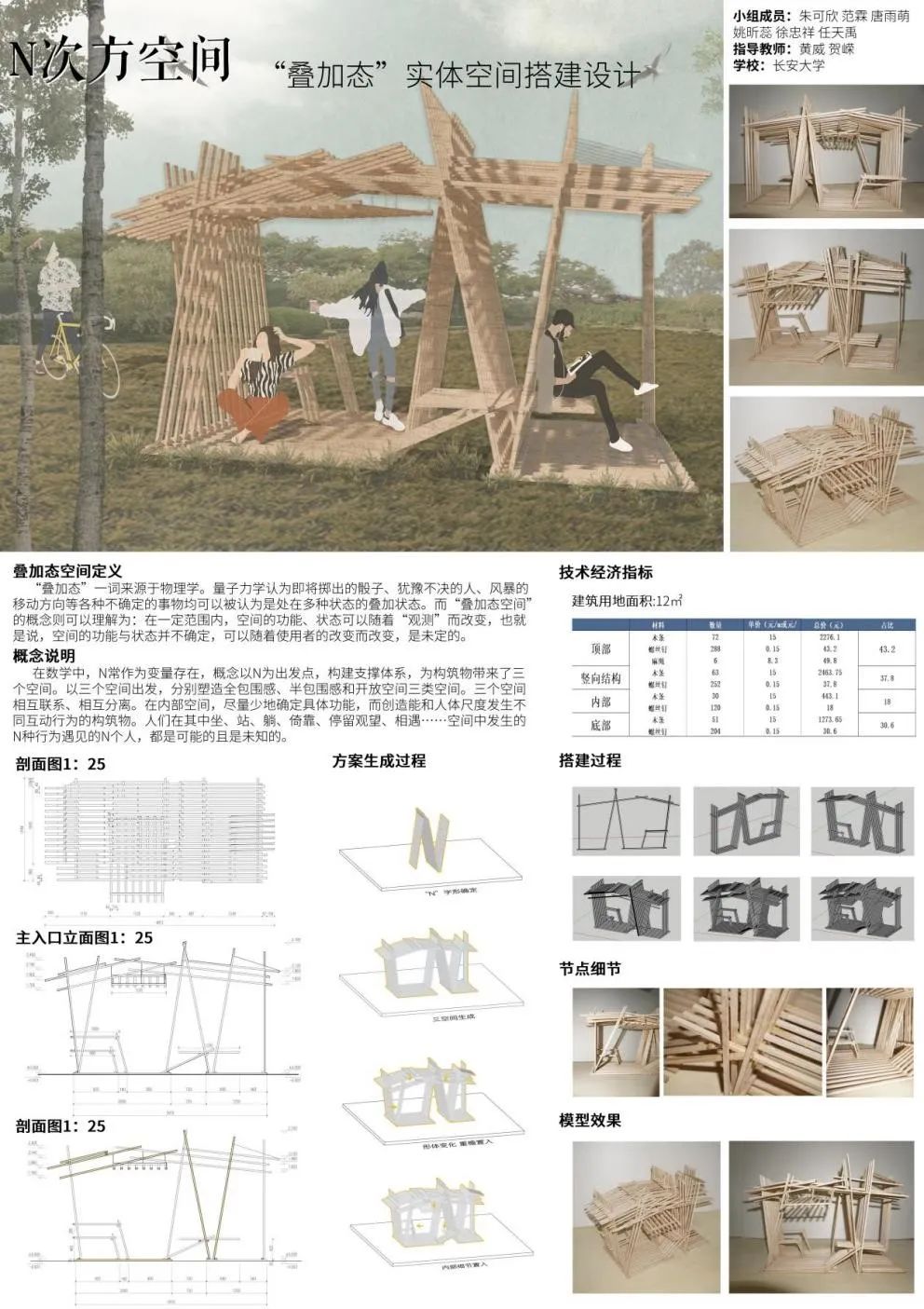 在过往三年的疫情时代,人们的公共生活发生了巨大变化,公共空间当中的构筑物功能属性会随着区域内疫情情况发生改变:花坛周围的凉亭可能会转变为核酸检测的临时站点、沿街的遮阳棚可能会为防疫人员提供临时休息区域。不可否认的是,这样的构筑物为动态化疫情防控工作节约了经济与时间成本,但也难以避免地存在功能适配性较低的问题。本次竞赛旨在鼓励学生思考如何利用一个构筑物创造一处适应后疫情时代的“叠加态空间”,它可以是静态的,利用空间层面的巧妙构思满足不同时段的功能要求;也可以是动态的,利用结构层面的创新设计实现灵活的动态响应。