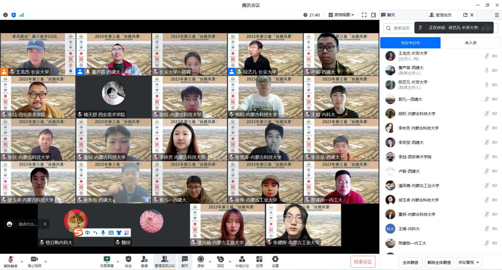 2023年4月22日上午,第三届“丝路风景”联合毕业设计中期答辩在线上拉开帷幕,来自西安建筑科技大学、长安大学、内蒙古工业大学、内蒙古科技大学、西安美术学院、苏州大学、西安理工大学7所高校50余师生参与本次活动。