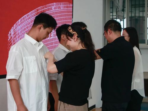 最后,澳门新葡京平台 研究生导师代表任娟、周吉喆、朱秋晨为2023级新生代表佩戴校徽并合影留念。