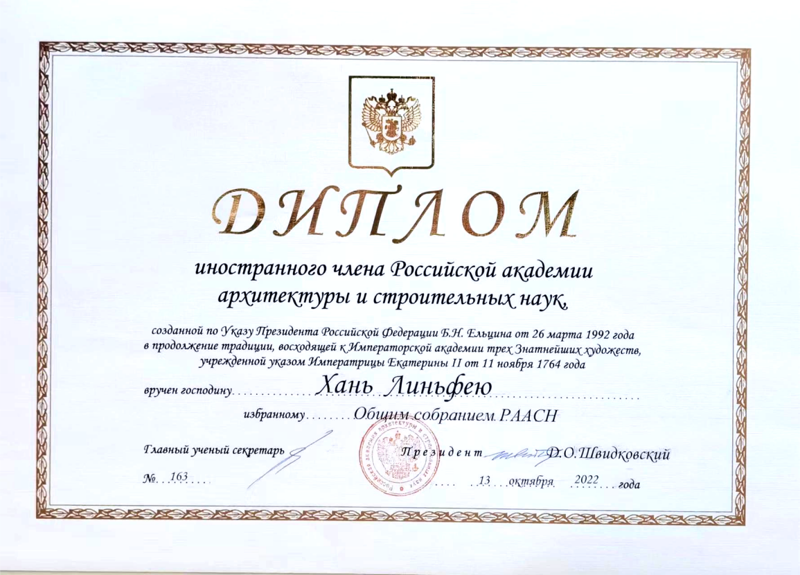 2022年10月13日俄罗斯建筑与建设科学院(RAACS)经全体院士投票选举我校1991届建筑学校友韩林飞成为俄罗斯建筑与建设科学院外籍院士,这是对韩林飞教授多年对苏联俄罗斯建筑研究的肯定,也是长安大学的荣誉。