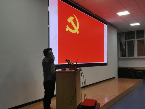 活动第一项,重温入党誓词,坚定理想信念。全体同志起立,右手握拳,在第一党支部副书记冀孟博同志的带领下,面向党旗宣誓。