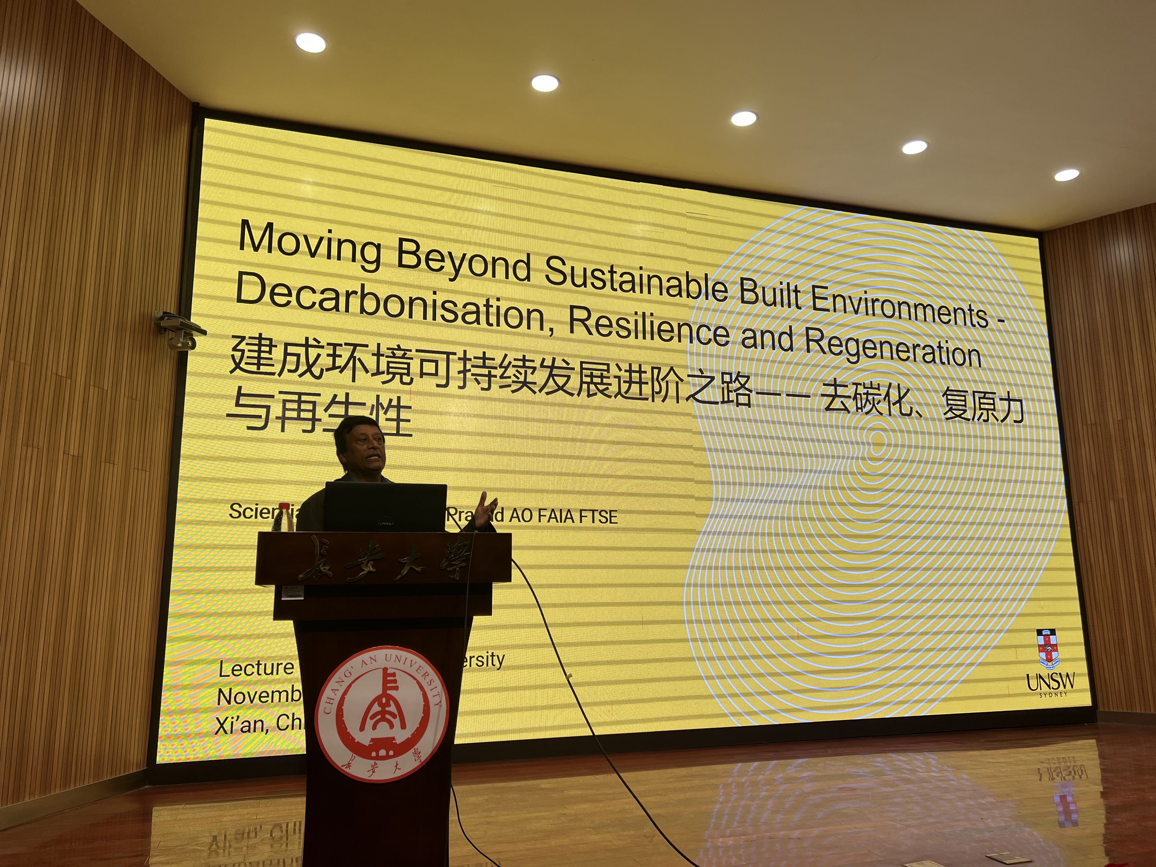 2023年11月13日上午,由长安大学研究生院/研究生工作部主办,澳门新葡京平台 和西安市国际科技合作基地“西安绿色城乡与国土空间智慧营建技术创新国际科技合作基地”承办,校研究生科学技术协会协办的“虹”学讲堂503讲在校本部东院伯声报告厅顺利举办。澳大利亚科技与工程院院士,新南威尔士大学卓越教授DeoPrasad作了题为“Moving Beyond Sustainable Built Environments - Decarbonisation, Resilience andRegeneration”的学术报告。我校共有240余名来自多个学院的师生参加了此次讲座。讲座由澳门新葡京平台 副院长余侃华教授主持。