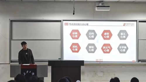 张老师首先从心理角度对同学们进行了考试违纪的心理分析。他指出,学生考试违纪的心理主要有:依赖心理、功利心理、虚荣心理、盲从心理、投机心理、冒险心理、讲义气心理、不平衡心理等,告诫同学们切勿抱有侥幸心理,考前认真复习,考时诚信应考,考后认真总结。