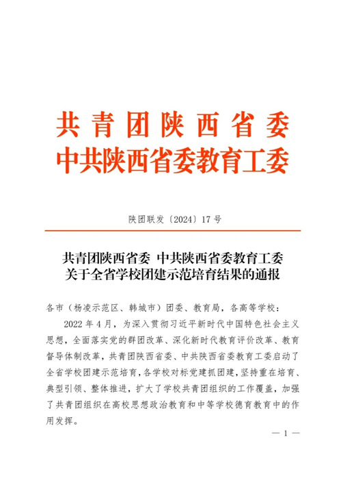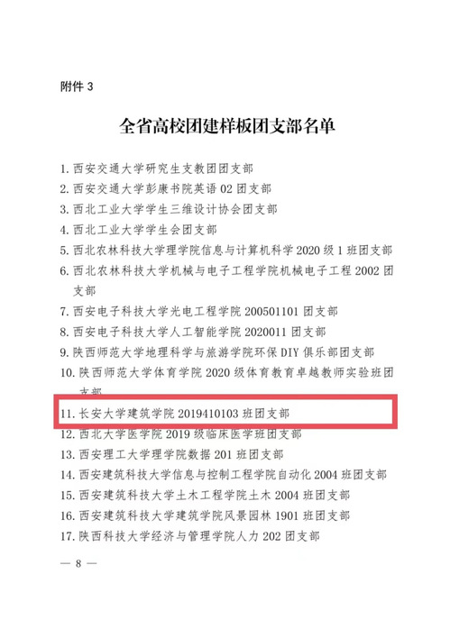 近日,共青团陕西省委、中共陕西省委教育工委印发《关于全省学校团建示范培育结果的通报》,我院2019410103班团支部被认定为“全省高校团建样板团支部”。