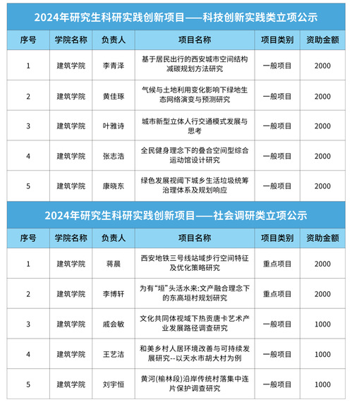 根据《关于申报2024年研究生科研创新实践项目的通知》,经过研究生申请、专家评审、院系推荐、学校审核等程序,共113个项目获准立项为长安大学2024年研究生科研创新实践项目,其中澳门新葡京平台 报送17个项目,成功立项10个项目,立项结果如下: