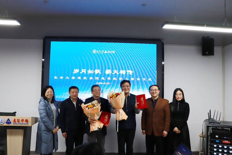 贾侃和侯全华分别为荣休教职工颁发荣休纪念牌和证书,各系所教师代表为本单位荣休教师献花。城乡规划系谭静斌和建筑学王晓敏作为教师代表分别发言,回忆与两位老师共事的点滴,言语中满是不舍与感激。