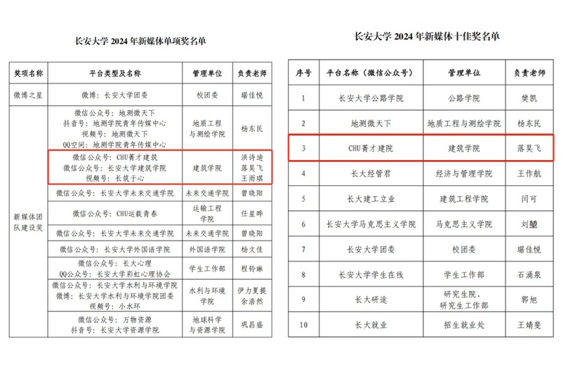 我院新媒体平台荣获长安大学2024年新媒体十佳奖、新媒体团队建设奖