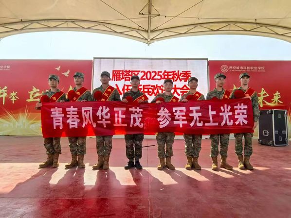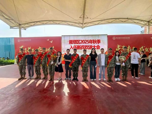 热血男儿志在军营,有志青年从军报国!9月14日,西安市雁塔区举行2025年秋季入伍新兵欢送大会,为即将踏上光荣之路、开启军旅生涯的新兵们送行。我院2025届本科生范甲鹏光荣应征入伍,武装部副部长王恩成、学院团委书记落昊飞代表参加了本次活动,共同见证这一无上光荣的时刻。