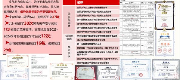 支部立足学科特色,打造专业品牌活动,在科研攻关领域,支部党员充分发挥先锋模范作用,累计发表SCI、EI等高水平学术论文50余篇,斩获国家级竞赛奖项30项、省部级竞赛奖项17项;16名党员参与国家级科研项目,29人投身省级项目,2023-2025学年20人次参与国家学术会议。人才培养方面,支部涌现出大批先进典型,6名党员获校级优秀共青团员,6名获评校级优秀共青团干部,8人当选优秀研究生干部。