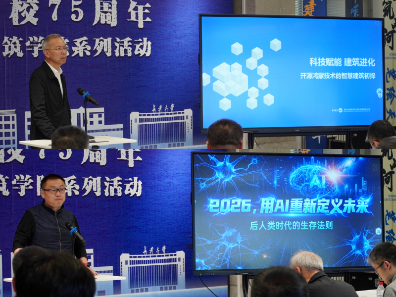 在科技赋能发展论坛环节,深圳市建筑设计研究总院有限公司党委副书记、总经理、我院88级校友章海峰作《科技赋能建筑进化——开源鸿蒙技术的智慧建筑初探》报告;上海品宅装饰科技有限公司总经理、我院93级校友向宠作《2026,用AI重新定义未来》报告。两位校友立足科技变革浪潮,聚焦智慧建筑、AI 技术与建筑行业深度融合,深入解读传统建筑专业创新升级路径,既为在场学子拓宽了建筑行业前沿视野,也为建筑教育革新发展贡献了宝贵思路,共同呈现了一场紧贴行业前沿、赋能学科创新的精彩分享。